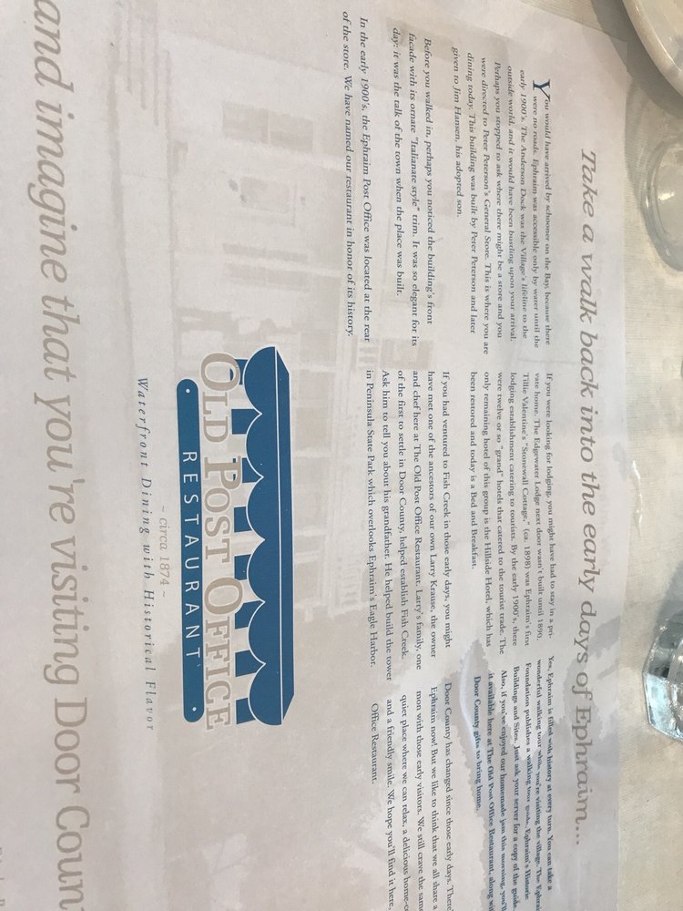 Welcome to Old Post Office Restaurant, a charming establishment in Ephraim, WI, known for its delightful Breakfast & Brunch and delectable Seafood offerings. With a plethora of amenities such as outdoor seating, wheelchair accessibility, and Happy Hour specials, this restaurant caters to a diverse range of patrons. The menu boasts a variety of options, from refreshing Letter Opener Juices to savory Express Mail Eggs. Customers rave about the fish boil experience, the mouth-watering cherry pancakes, and the exceptional service provided by the friendly staff. Whether you're a local or a visitor, Old Post Office Restaurant promises a memorable dining experience with its picturesque waterfront location and inviting atmosphere. Don't miss out on this gem in the heart of Door County!